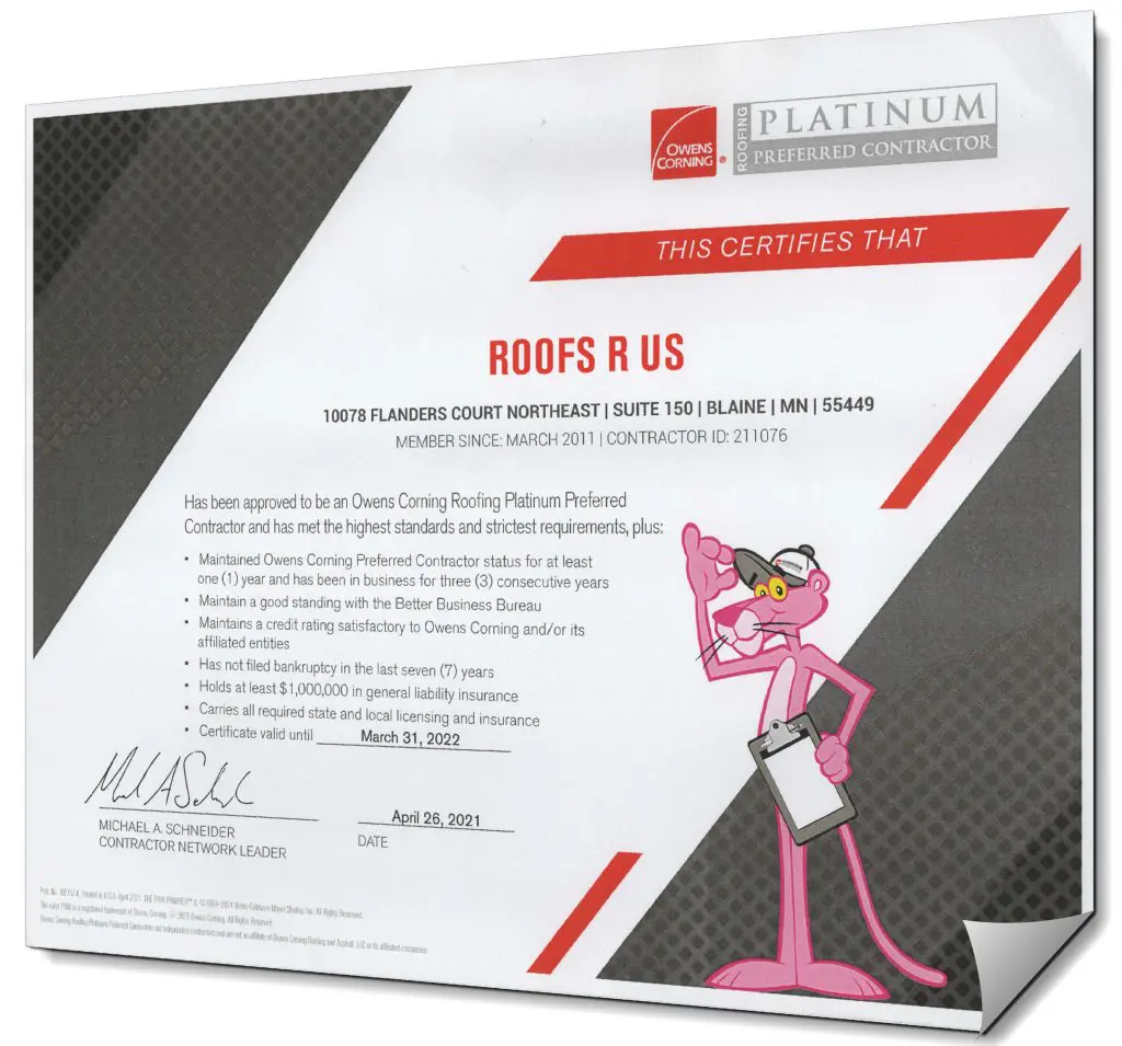 As an Owens Corning Roofing Platinum Preferred Contractor, Roofs R Us was recognized at the 2021 Owens Corning Roofing Platinum Awards. During the ceremony, we were honored with the Platinum Preferred Award for our company’s industry-leading contributions to the roofing category. This industry recognition reflects our continued focus on bringing a results-oriented, customer-driven approach to running our business and delivering trustworthy, dependable work for Minnesota homeowners.